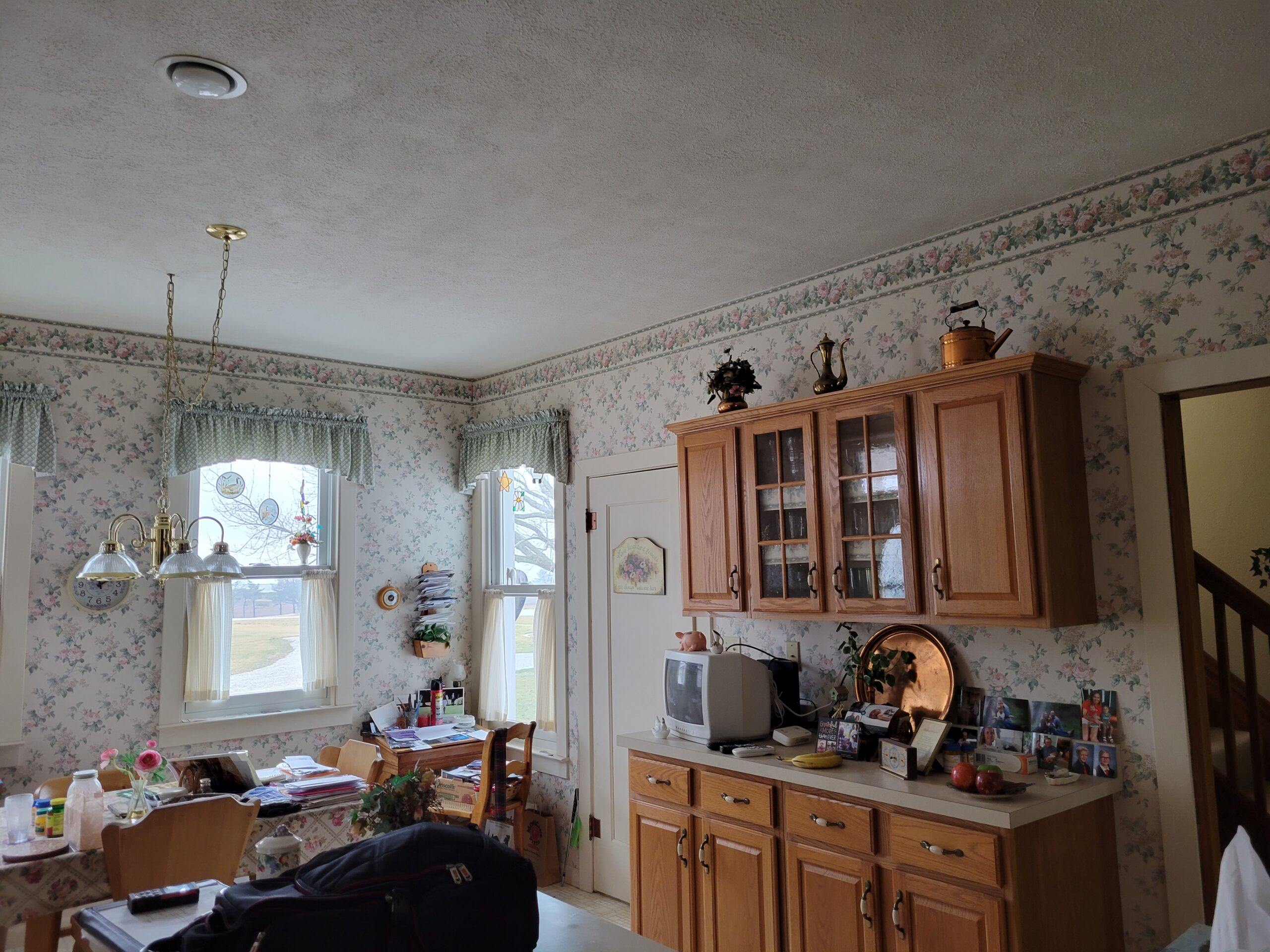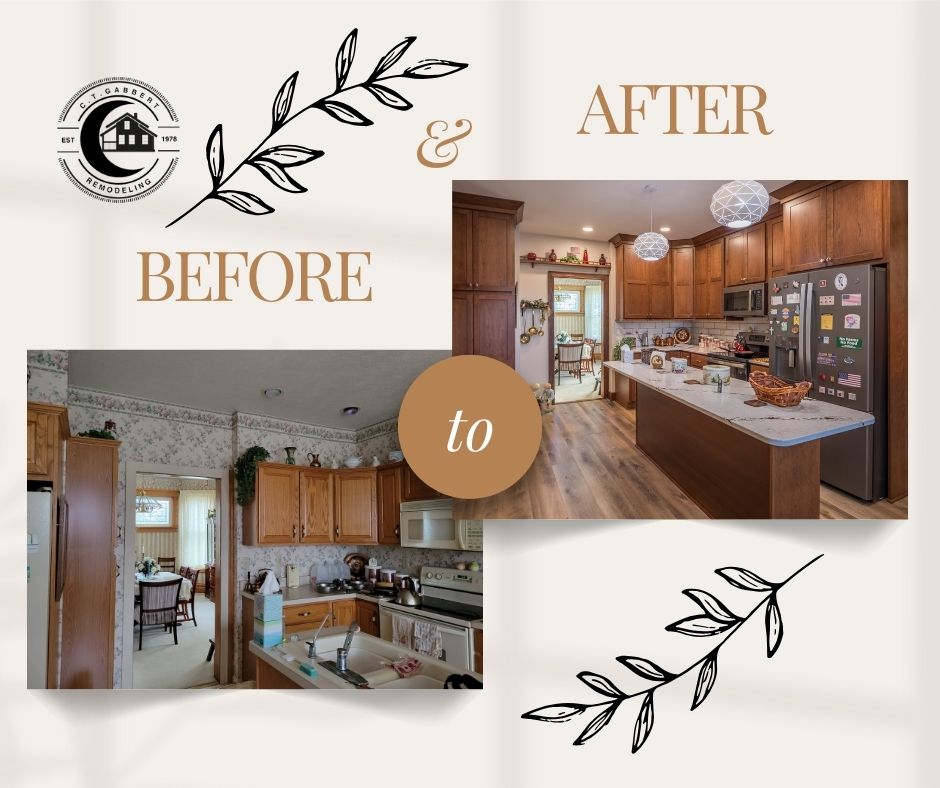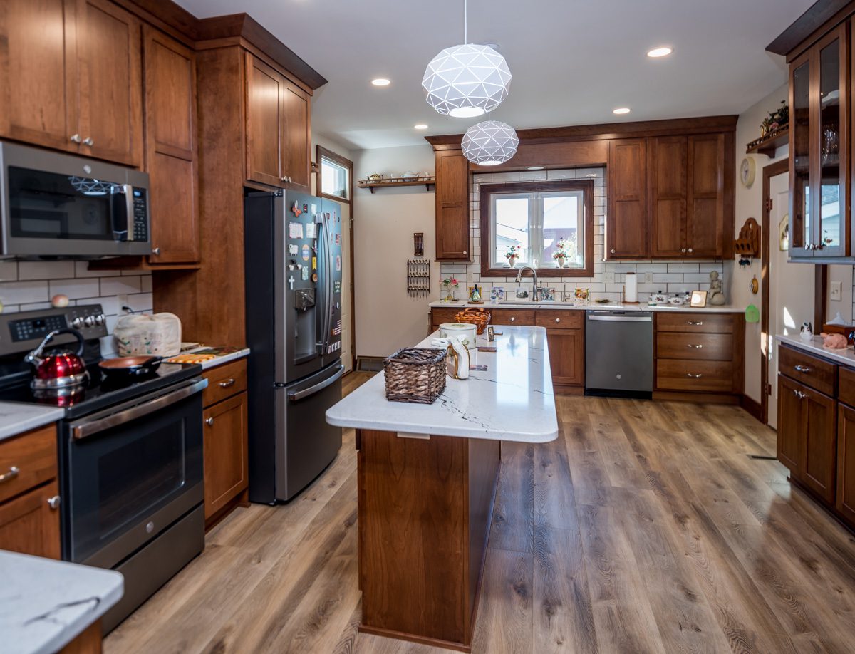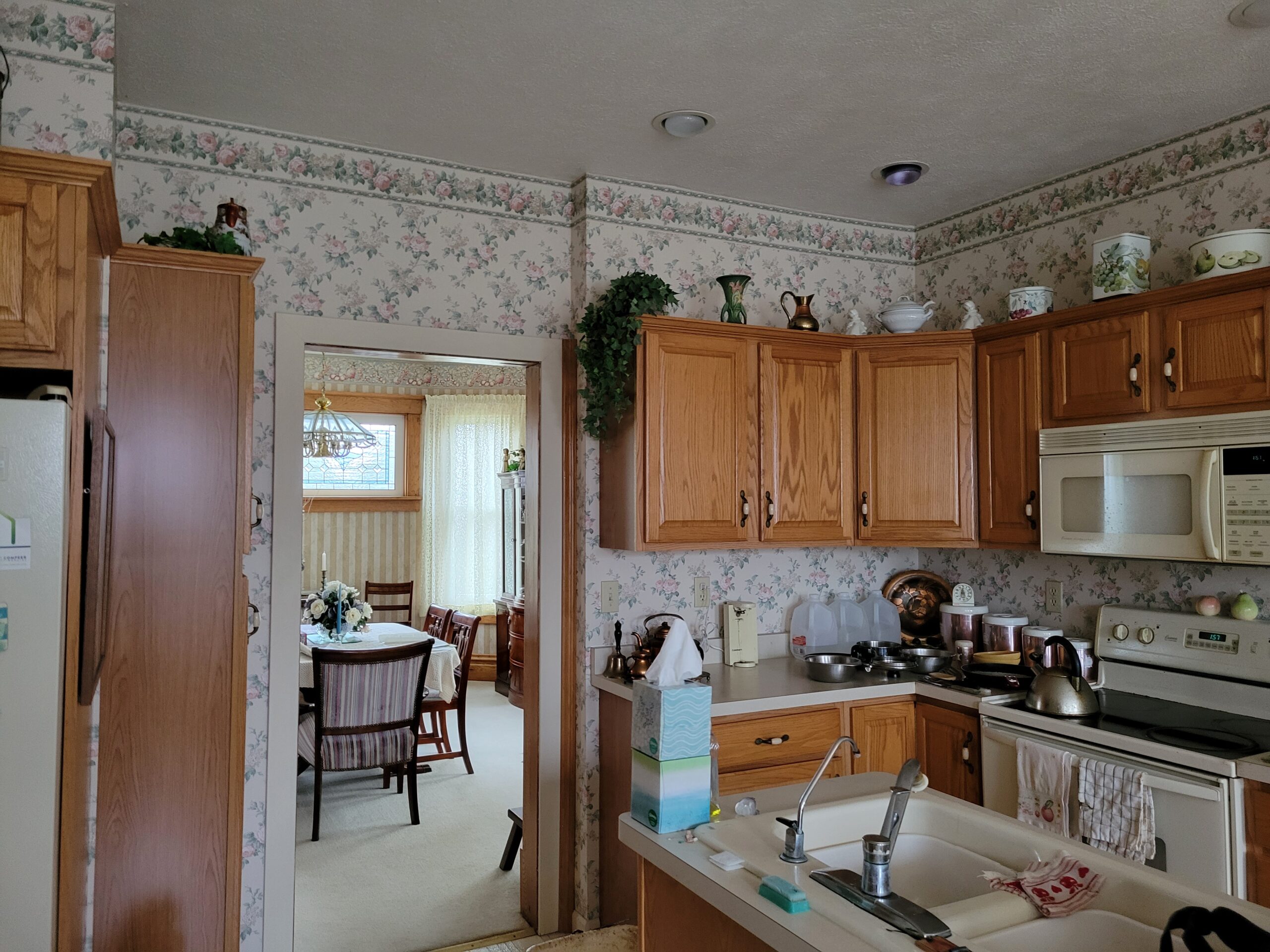 Turning this kitchen into a modern, open-concept design. Taking out the wall paper and put in extended wood shaker cabinets all the way to make the space more elevated, with a crowning at the top, as well as to add warmth and sophistication. We closed off a door and add in a space for the refrigerator and extra cabinet space. adding a new wall for the sink and dishwasher area, so there is more open space on the island. This room is transformed into a more functional space with a modern aesthetic.