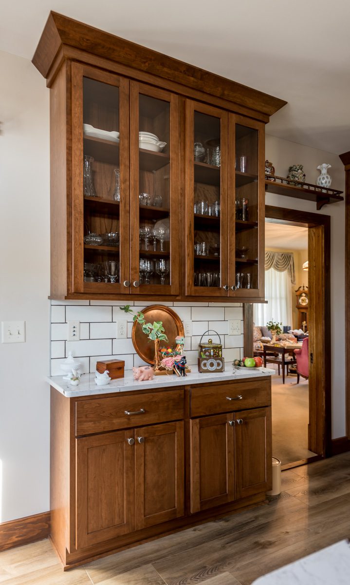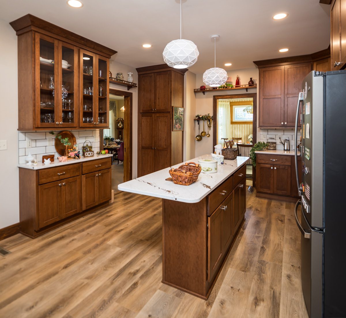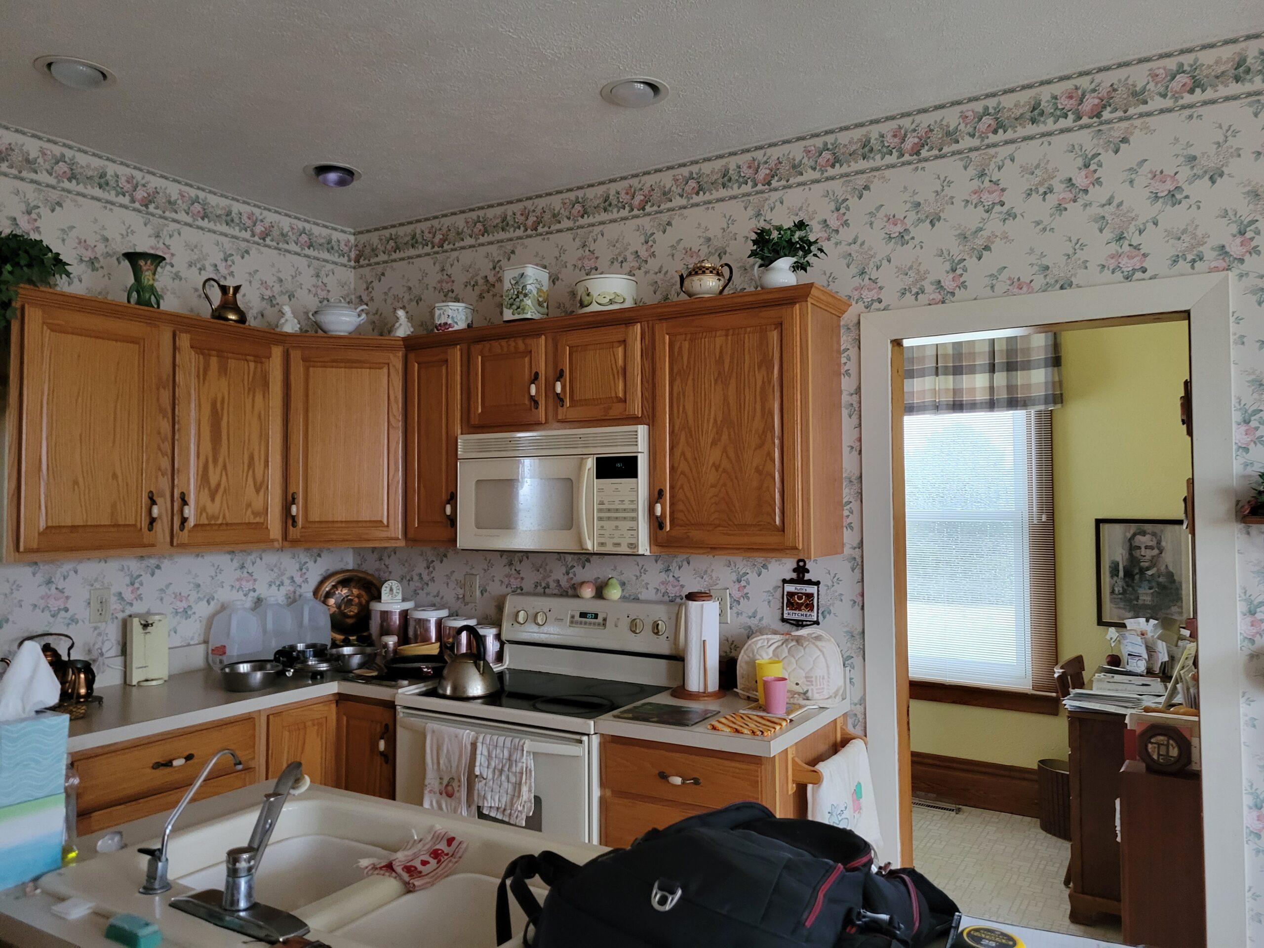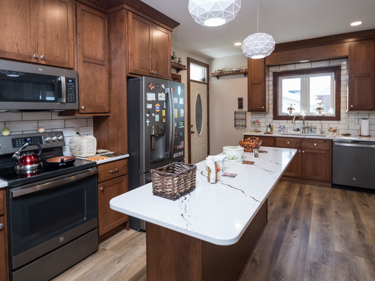 Turning this kitchen into a modern, open-concept design. Taking out the wall paper and put in extended wood shaker cabinets all the way to make the space more elevated, with a crowning at the top, as well as to add warmth and sophistication. We closed off a door and add in a space for the refrigerator and extra cabinet space. adding a new wall for the sink and dishwasher area, so there is more open space on the island. This room is transformed into a more functional space with a modern aesthetic.
